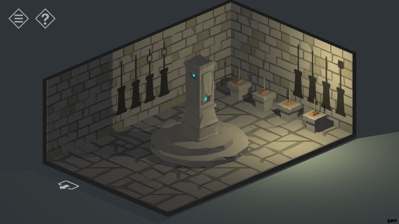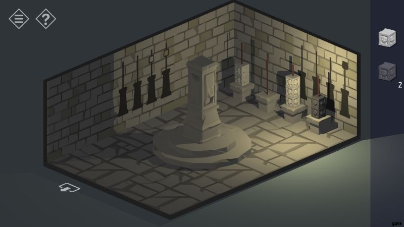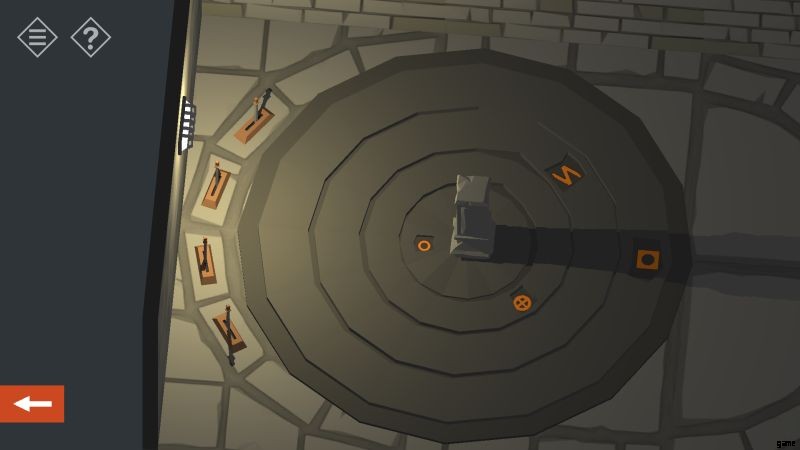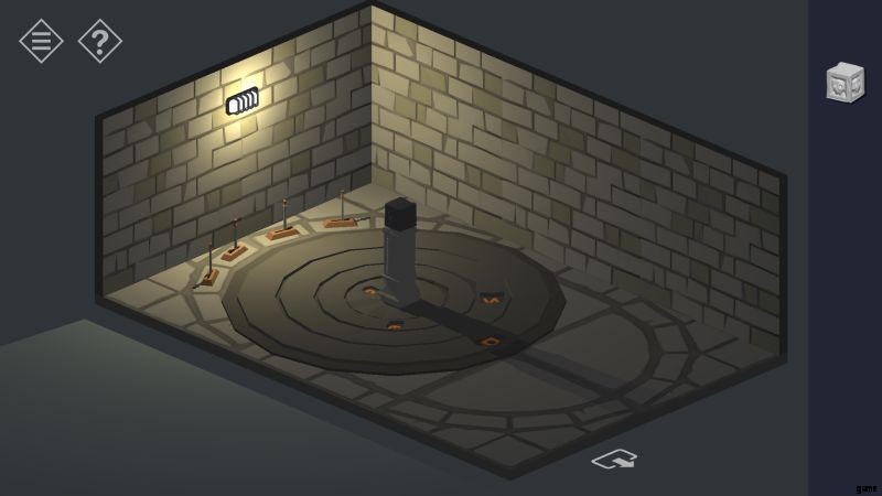 最初の部屋には石の輪のセットがあり、それぞれの輪には異なる形をした穴があります。各リングには対応するレバーがあり、これらのリングを回して穴に見える形状を変更します。リングの中央には柱があり、その上に灰色の立方体の石があります。立方体を持って部屋を出てから、彫像を向きを変えて入り口の向こう側のドアに向けます。