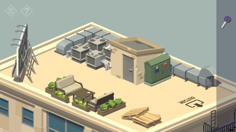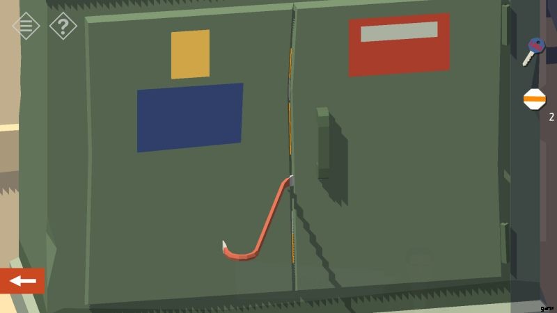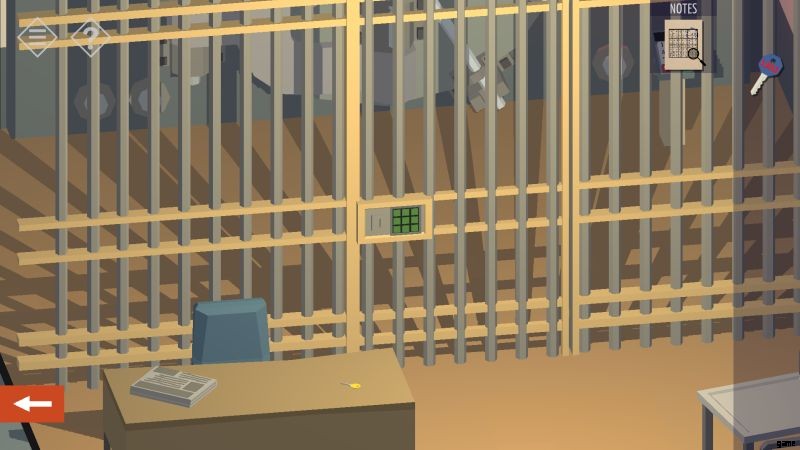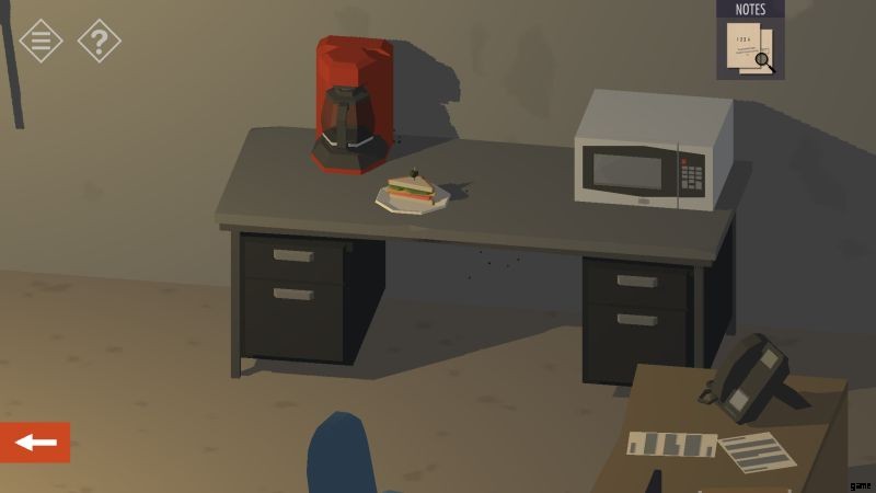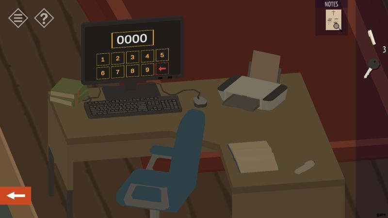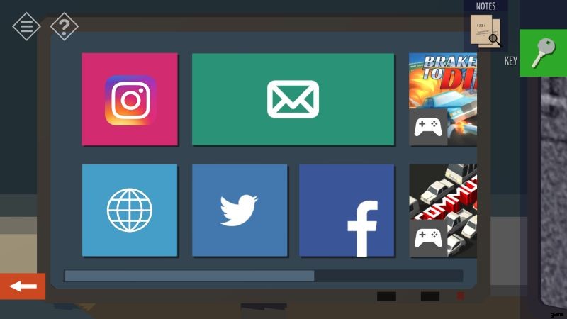 開発者の以前のゲームやソーシャル メディア アカウントへのリンクは別として、コンピューターの画面をスクロールすると、ブーム ゲートへのコントロールが表示されます。残念ながら、コンピューターは、ゲートの接続が誤動作しているように見えると報告します。ゲートを開こうとした後、メモ帳のアイコンをタップして、屋根の南京錠のコードを学習します。屋上に向かう前に、サンドイッチデスクに行き、左上の引き出しをタップしてください。いくつかのドキュメントの上にキーがあるはずです。取ってください。