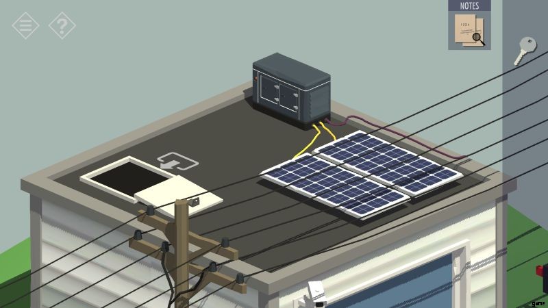 屋根には、2 つのドアがある電気エンクロージャが表示されます。左の扉は解錠されていますが、右の扉は施錠されています。机の鍵を使用して右側のドアのロックを解除し、ゲートの問題を明らかにします。ケーブルの 1 つが取り外されています。ケーブルを再び差し込み、コンピュータに戻り、ブーム ゲートを持ち上げます。今、あなたは車で入って、何が悪いのか見るためにあなたの父親を訪ねることができます.