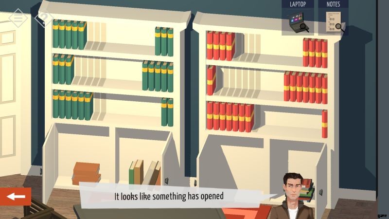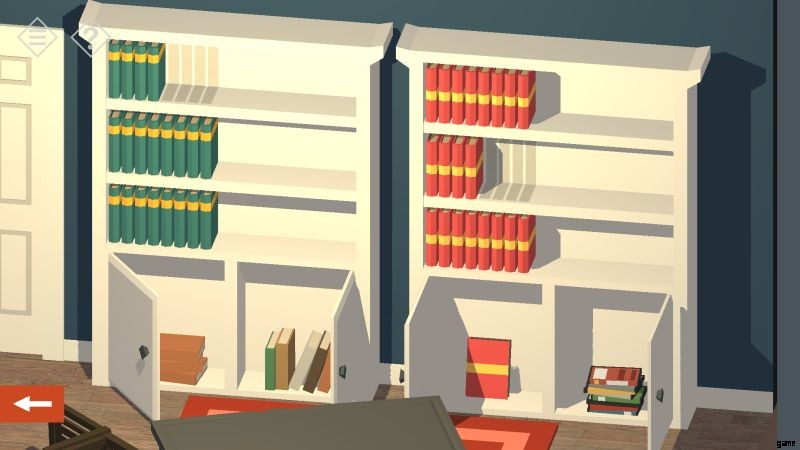 …誰かがあなたの父親の家を荒らし、リビングルームが完全に混乱していることを知るだけです。最初に気付くのは、本棚から8冊の本がなくなったキャビネットが2つあり、それらは緑または赤に着色されており、それらのキャビネットの隣に鍵のかかったドアがあります.家の中を調べながら、これらの本を見つけます。