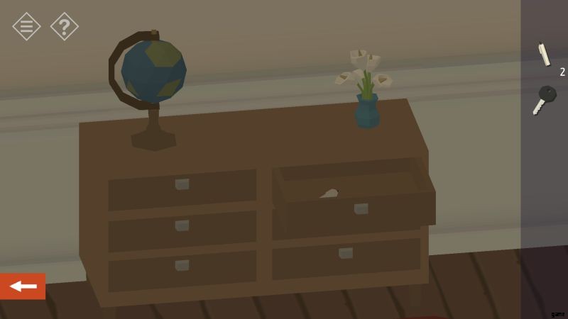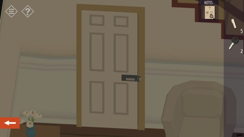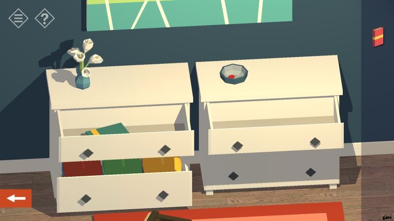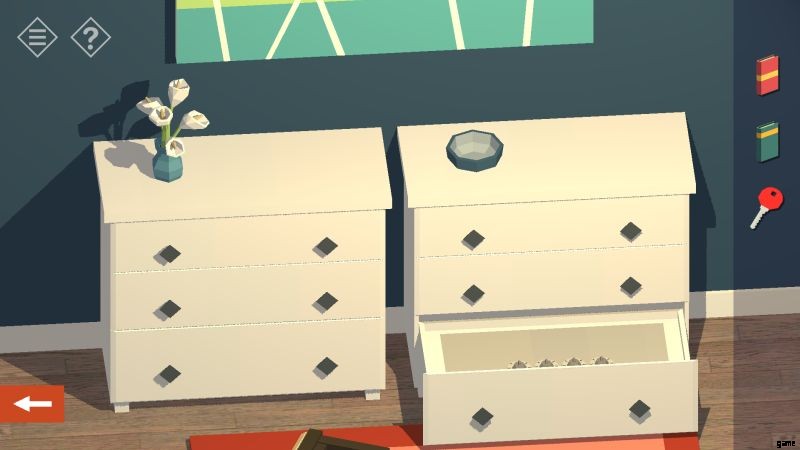 ナイフを装備した状態でソファのパッチを操作して切り開き、別の赤い本 (2 赤) を発見します。その後、ストーブから学んだ組み合わせを使用して金庫のロックを解除します。金庫の中には、手に取ることができない銃と、いくつかのテレビチャンネル、番号付きのシーケンス、および「照明が重要です」というフレーズが記載されたメモがあります。ドレッサーの隣にあるマスター ベッドルームに向かいます。ボウルの中にある赤い鍵でロックを解除できます。
