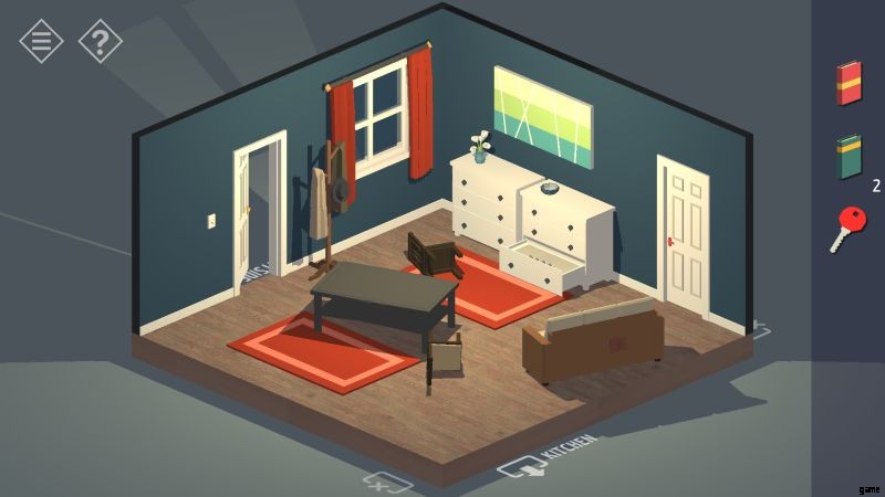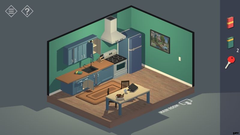 赤い本棚の下の棚に赤い本が1冊(1赤)あります。本棚の反対側には一対のドレッサーがあります。右のドレッサーには赤い鍵付きのボウルがあり、一番下の引き出しにはダイヤルが 4 つ付いた金庫があります。一方、左のドレッサーの一番上の引き出しには緑の本(緑1冊)があります。本と鍵を拾う。ソファを動かし、カメラの向きを変えてソファの後ろを操作すると、コーヒー テーブルの下に別の緑色の本 (2 つの緑色) が表示されます。ソファ自体には謎のパッチがありますが、パッチを切り開いて何が隠されているかを確認する方法はありません.ソファを無視して、正面玄関の真向かいにあるキッチンに向かいます。