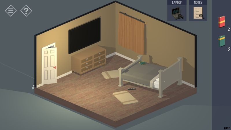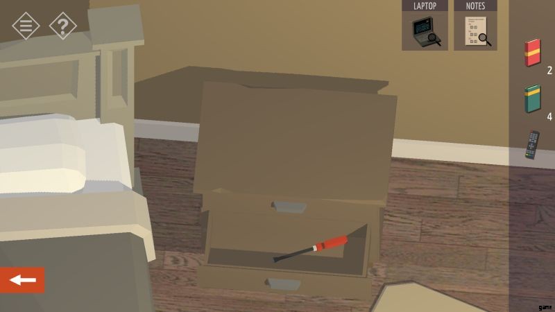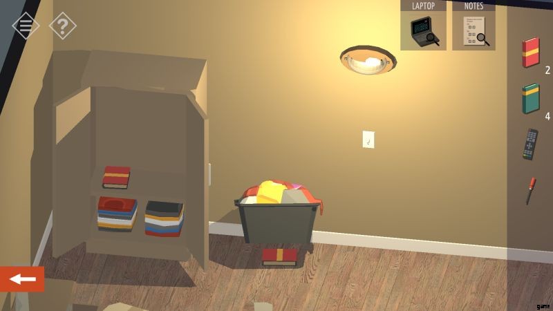 あなたのお父さんの寝室もごちゃごちゃで、ベッドの上に最後の緑の本 (4 緑) があり、床にはリモコンがあります。両方のアイテムを手に取り、エンドテーブルの真ん中の引き出しを開けてドライバーを見つけます.画面を回転させて、ドレッサーが下にあるテレビ、キャビネット、物が入った洗濯かご、壊れたスイッチのある壁のライトを見つけます。最後の 2 冊の赤い本 (3 と 4 の赤) はキャビネット エリアにあり、1 つはキャビネット自体にあり、もう 1 つはバスケットの下にあります。これにより、4 つの赤い本と 4 つの緑の本が得られるはずです。テレビと一緒にリモコンを使用して、リビングルームから金庫のノートで見つけたチャンネルを入力できます。ただし、引き出しのペアを自動的に開くだけです。同じノート/チャンネル リストに書かれたフレーズを覚えていますか?ライト スイッチが壊れているので、ドライバーを使用してライト シェードを取り外し、電球を手動で緩めます。その秘密が明らかになります。