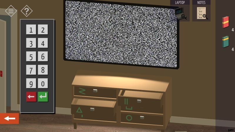 ドレッサーの引き出しには、暗闇で光るインクでシンボルが描かれています。これらの記号は、ラップトップのパスワードに使用される記号と一致します。メモに記載されている順序でチャンネルを入力し、どの引き出しが開くかを覚えておいてください。次に、引き出しが開く順序で表示される記号を入力して、ラップトップのロックを解除します。ラップトップのインターフェイスは、守衛所にあったものと似ていますが、重要なのはカメラ アイコンをタップすることです。これにより、特定のパターンで配置された本が表示されます。