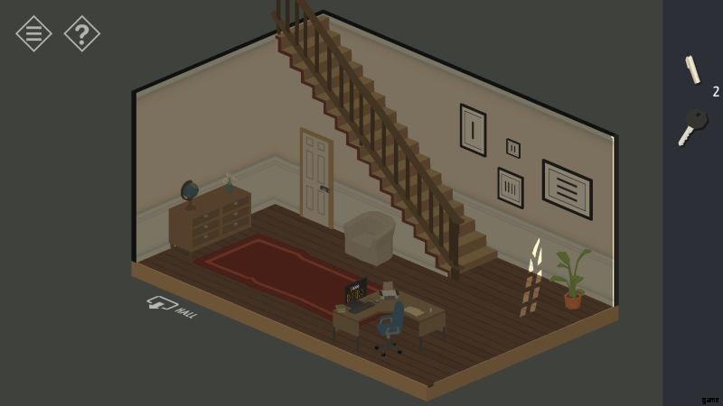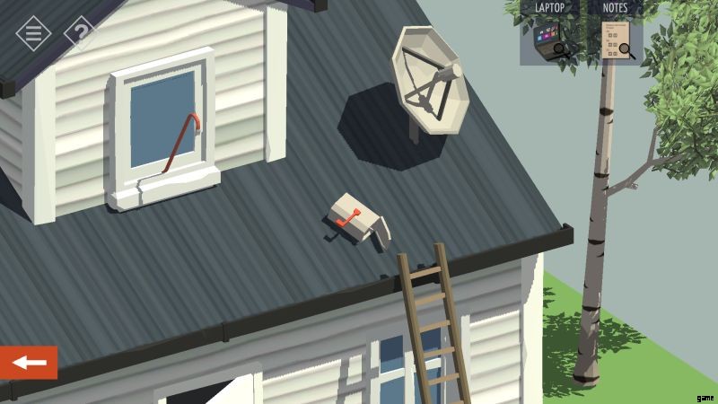 リビングルームに戻り、本を本棚に戻し、ノートパソコンに表示された位置に本をタップして移動します。本が配置されると、本棚の隣のドアが開きます。ここには、屋根裏部屋に上がるはしごのある廊下と、床にバールがあります。廊下には一組の絵画が飾られた壁があり、1 つは明らかにラインナップから抜けています。また、屋根裏部屋が塞がれているように見えることにも気付くでしょう。外に戻ると、郵便受けの近くに屋根裏部屋に通じる窓がありました。バールを手に取り、屋根に戻り、バールで窓を開けて中に入ります。