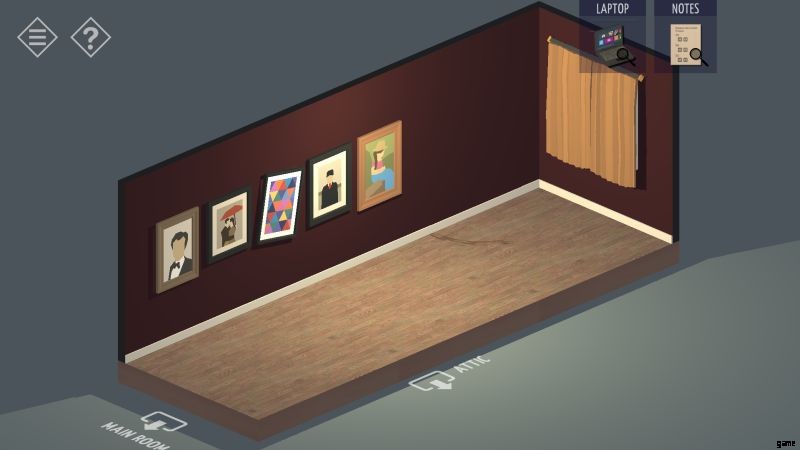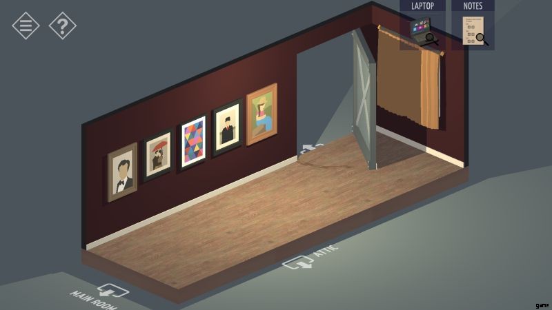 屋根裏部屋には、注意すべき点が 3 つあります。(1) 廊下のはしごからのアクセスをブロックしている箱、(2) 失われた絵画、(3) この家に地下室があることを示すいくつかの設計図。絵を手に取り、箱を邪魔にならないように動かして、階下に戻れるようにします。なくなった絵を元の位置に戻すと、置いた瞬間に曲がっていることに気付くでしょう。絵をまっすぐに伸ばすたびに、2 つの絵が曲がってしまいます。ここでの目標は、すべての絵をまっすぐにすることです。 5 つの絵がすべてまっすぐになると、地下室につながる秘密のドアが開きます。