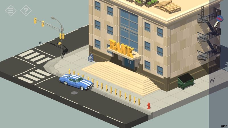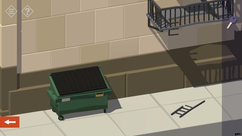 レッドクリフはまだ閑散としており、銀行に列を作る必要はありませんが、正面玄関はしっかりとロックされています。カメラを右にスワイプすると、屋根に登れる非常階段が表示されます。壊れたはしごは役に立たないので、代わりに近くのゴミ箱を使用します.タップしてゴミ箱を所定の位置に押し込みます。