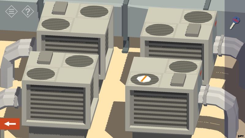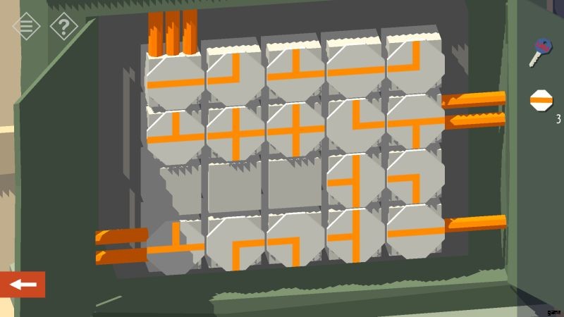 中にはタイルパズルがあり、4本のオレンジ色のワイヤーを揃える必要があります。屋根の上にある 3 つのタイルは、ボード上の 3 つの空きスペースに対応しています。各タイルをタップして反時計回りに回転させます。パズル自体はそれほど難しくありません。すべてのワイヤーが整列すると、ドアのロックが解除され、中に入ることができます。 3 階は特に何もないので、2 階に降りてください。