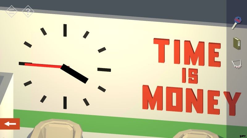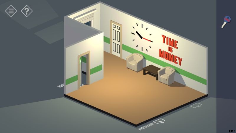 2 階には 3 つのドアがあります。1 つのドアは 1 階に通じており、もう 1 つのドアはトイレに通じており、最後のドアは会議室に通じています。会議室のドアの横にも時計があり、近くに「Time is Money」というフレーズが目立つように表示されています。とりあえずトイレと会議室は施錠されているので1階へ。