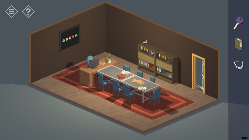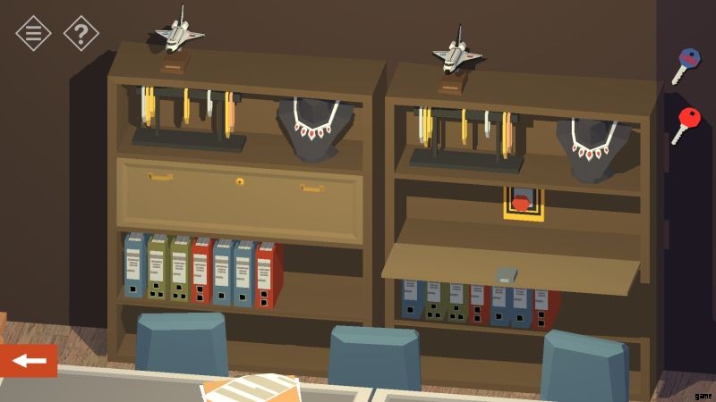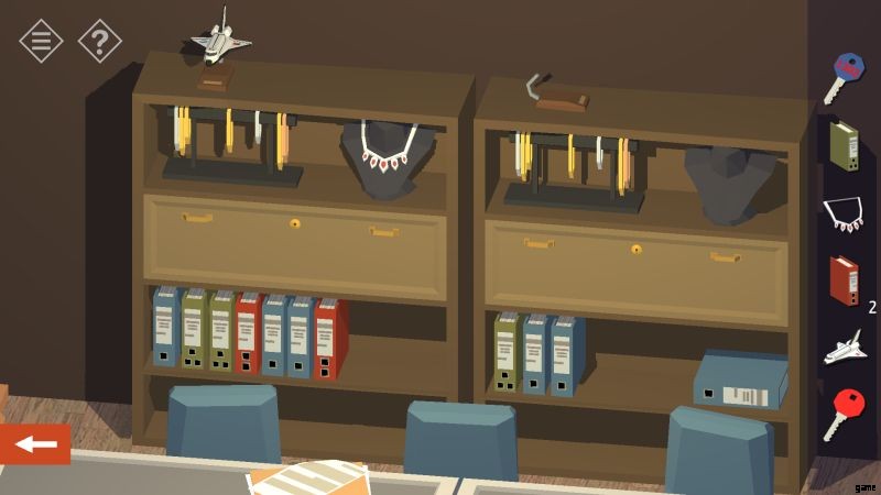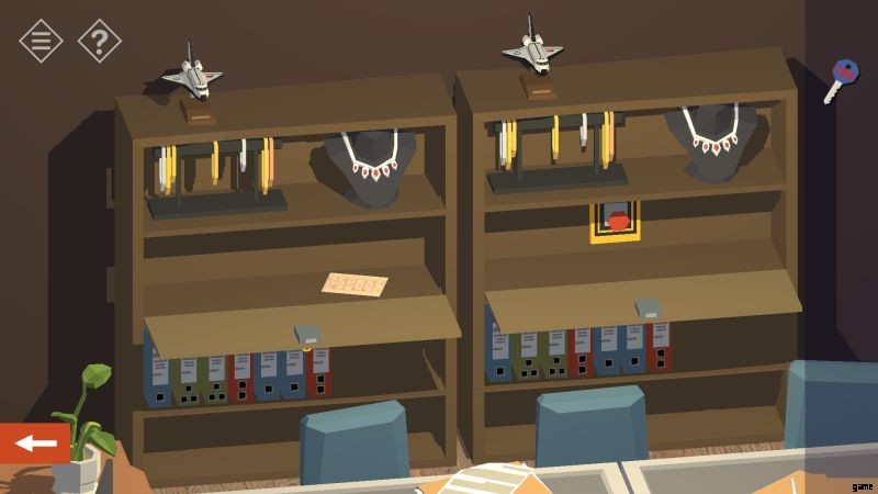 会議室のドアと同じ壁には、ほぼ同じ内容の棚が 1 組ありますが、右側の棚にはいくつかのものがありません。鍵とは別に、あなたが集めたアイテム (緑のフォルダー、ネックレス、赤のフォルダー、宇宙船) は、左の棚の内容と一致するように、右の棚に配置されます。