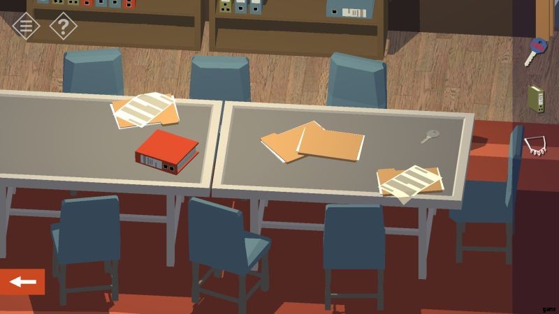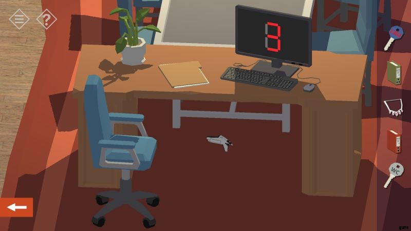 フォルダーとネックレスを持って、2階に戻り時計を操作。時針と分針を軽くたたいて、時計の時刻が1階に表示されている時刻と一致するように調整します。時間が一致すると、会議室へのドアのロックが解除されます。会議室に入ると、赤いフォルダーとトイレの鍵がテーブルに置かれているはずです。それらを拾った後、カメラを回転させて机にアクセスできるようにします.椅子を後ろに引き、床にあるおもちゃの宇宙船を拾います。コンピューターのスクリーンセーバーとして機能するシフト番号は、後で役に立ちます。