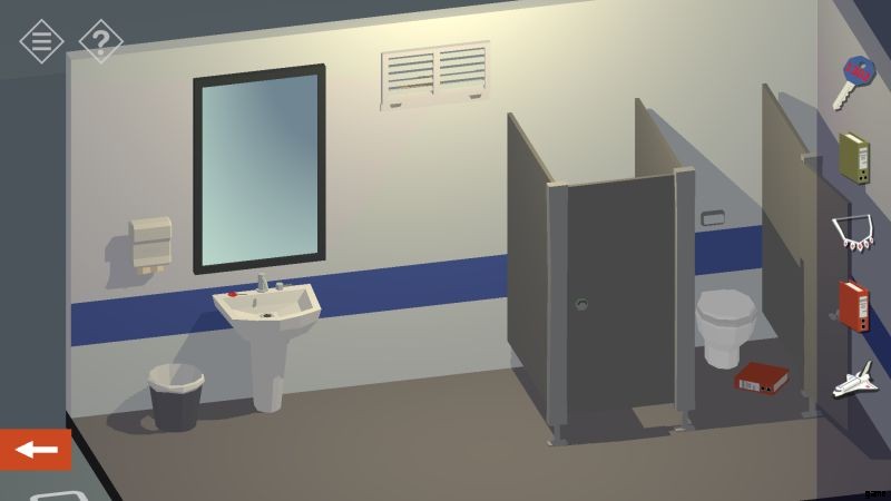 会議室に入る前に、トイレの鍵を使用してトイレのロックを解除してください。トイレでは、シンクに赤い鍵があり、バスルームのストールの 1 つに別の赤いフォルダーがあるはずです。それらを受け取り、会議室に戻ります。