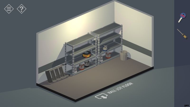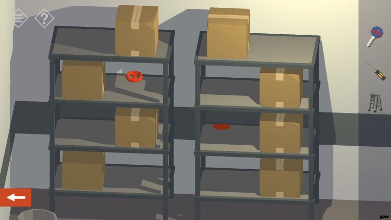 1階に降り、フロント奥の部屋の鍵をトイレの鍵で解錠すると物置へ。ドアの真向かいにある脚立を手に取り、そこにいる間にカメラを回して、箱でいっぱいの 2 つの棚を見つけます。各棚の 1 つのボックスには、その後ろにバルブが隠されています。ボックスをタップして、バルブを見つけて集めます。
