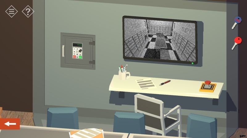 両方の棚の内容が一致すると、右側の棚のドアが開き、ボタンが表示されます。ボタンを押すと壁が回転し、テレビ、金庫、壁を元の位置に戻すためのボタンを含む秘密のコンパートメントが現れます。テレビが銀行の金庫室に設置されたカメラに接続されている間、金庫のキーパッドにはドライバーが詰まっています。ドライバーを取り、コンパートメントを放っておいてください。
