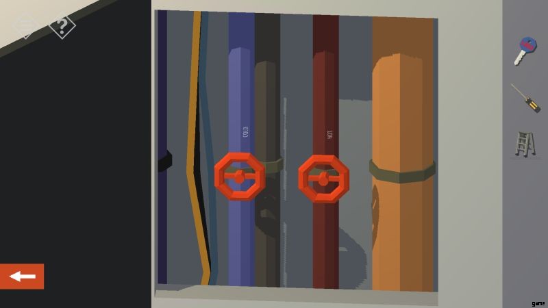 両方のバルブと脚立を手元に置いて、トイレに行き、シンクの反対側のドアに最も近い絵をタップします.これにより、たまたまこれらのバルブが欠落している水道本管が露出するはずです。バルブを元に戻した後、温水パイプと冷水パイプの両方をオンにすることができます.ただし、この章を進めるためには、温水パイプのみをオンに戻してください。カメラをシンクに向け、蛇口をひねります。スチームは、2 階の時計を調整できる別の時間を示します。