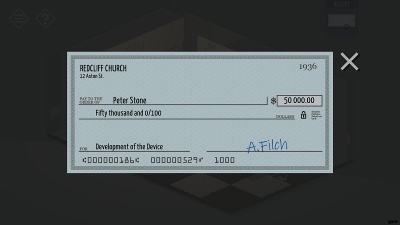 金庫がどのように配置されているか判読できない場合は、キーでロックが解除されるボックスの場所を確認できます。預金箱の中には、あなたの父が署名した小切手があり、かなり多額を教会に寄付しています。そのお金の目的が何であれ、調査の結果、町の教会にたどり着きました。