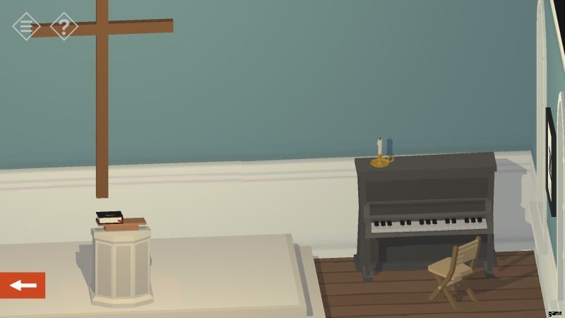 必要に応じてピアノで遊ぶことができますが、ピアノの上にあるろうそく (ろうそく 1) を忘れずに集めてください。教会の周りには全部で 7 つのろうそくがあり、それらはすべて別のパズルで使用されます。