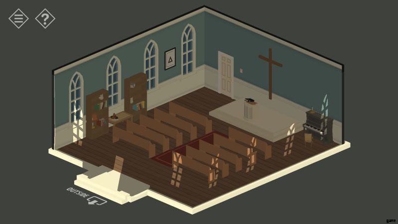 Once the pews are in place, head to the pulpit and open the Bible, revealing a hidden lever. Pull it, and if the pews are in the right spots, a secret staircase descends to a room under the church. This room houses that box you saw on the computer, and if the box is open, you can use the three black keys to unlock the door nearby, revealing some ancient ruins.