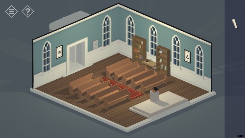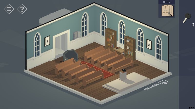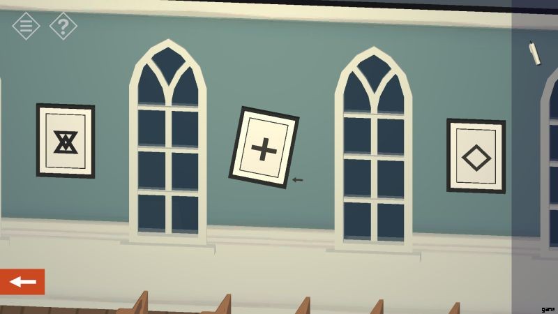 教会の周りにはシンボルが描かれた 5 枚の絵が飾られており、そのうちの 3 枚は同じ壁に描かれています。カメラを回転させると、教会の入り口の横に鍵のかかった箱が映っています。ボックスはシンボルをコードとして使用しますが、シンボルを配置する順序は教えてくれません。カメラを 3 つの絵画に移動し、中央の 1 つをタップすると、ボックスのコードの順序を示す矢印が表示されます。ボックスのロックを解除して黒い鍵を見つけてください。