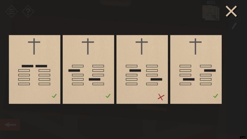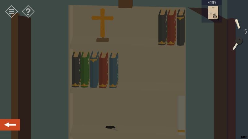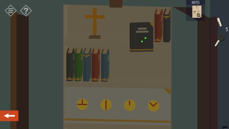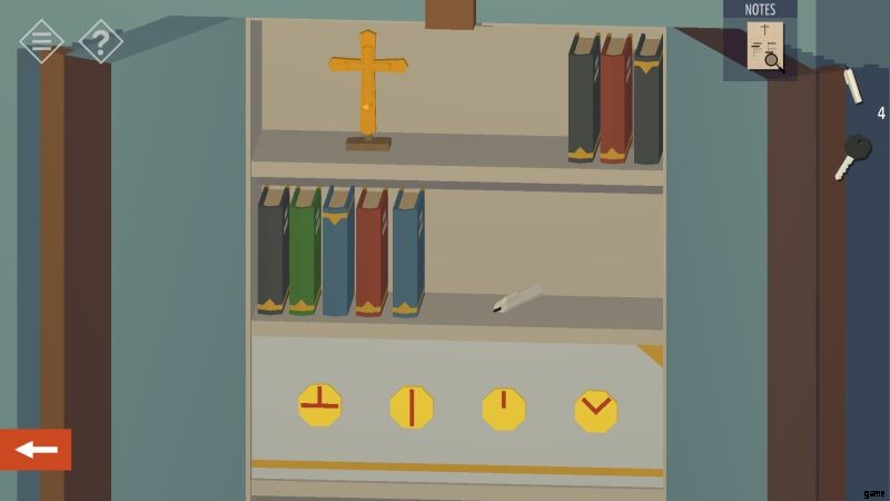 教会に戻り、ピアノでアクセス コードを弾いて、十字架の後ろにある隠し棚を開きます。棚には、それぞれに独自の線のセットがある 4 つのダイヤルを備えたロックされたコンパートメントがあり、別のキャンドル (キャンドル 5) を手に取ることができ、カバーに 3×3 グリッドのドットがある本がいくつかあります。教会の照明を消すと、ドットに描かれた光るインクが現れます。その中には、さまざまな方向で文字盤に描かれた線と一致するものもあります。ダイアルを回して線を点に合わせますが、関連する 2 冊の本が上下逆になっていることに注意してください。それに応じてパターンを変更する必要があります。ダイヤルを一致させると、別の黒い鍵が見つかるコンパートメントのロックが解除されます。それを手に取り、奥の部屋に戻ってください。