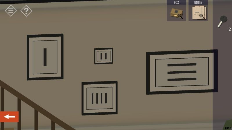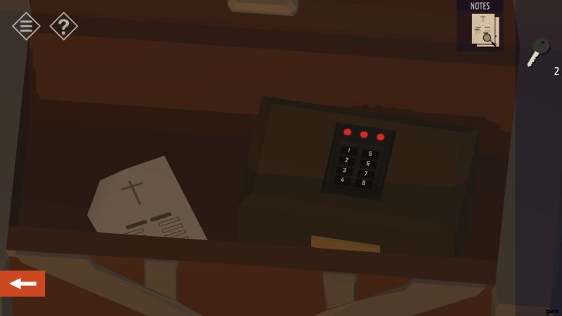 Return to the room under the stairs and use the brown key to unlock the trunk, finding another pew pattern and a locked box with a keypad. Viewing the locked box’s underside reveals four rectangles scratched on the surface, which match the shape of four paintings hung close to the stairs. Following the order of the rectangles, input the code to unlock the box and find the last black key. Return to the church.