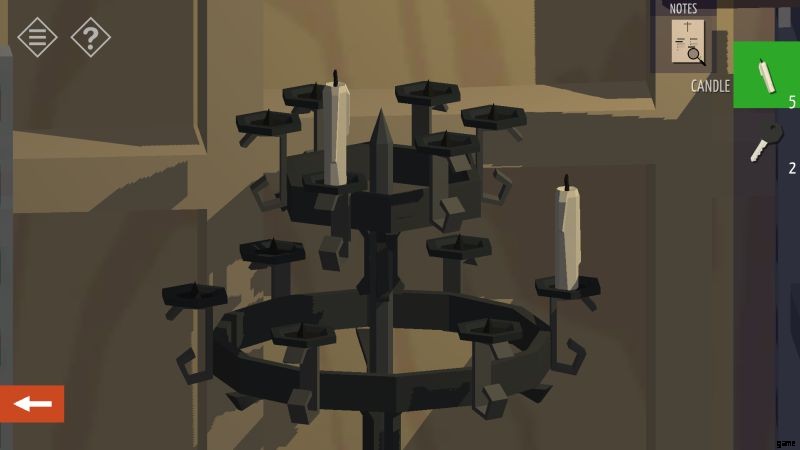The main goal of the candelabrum puzzle is to find the candle holders that are weighed down by the candles; there are twelve candle holders in total. You can tap each ring of candle holders to cycle to ones that are too far away for you to interact with, and because of that we cannot give you the exact candle holders that are affected. All we can say is that the lower ring uses three candles and the upper ring uses four candles. Once all the candles are in position, the compartment under them should unlock, giving you a brown key. Moving back to the shelves, go to the left shelf where you will find another sheet of paper depicting a pair of pews in a position that should NOT be followed. Pick that up, and continue to the bell tower on the other end of the attic.
