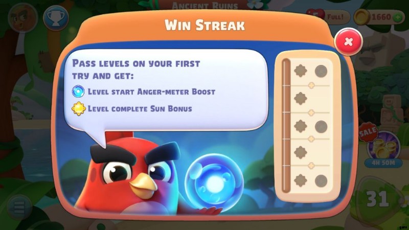 Angry Birds Journey には 連勝 があります 最初の試行でレベルを完了するといっぱいになるボーナス。連勝メーターがいっぱいになると、ステージの開始時に最初の鳥を最大 3 羽まで無料で Angry にアップグレードできます。また、これらのボーナス チェストをより速くヒットするための追加のサンライトも得られます!