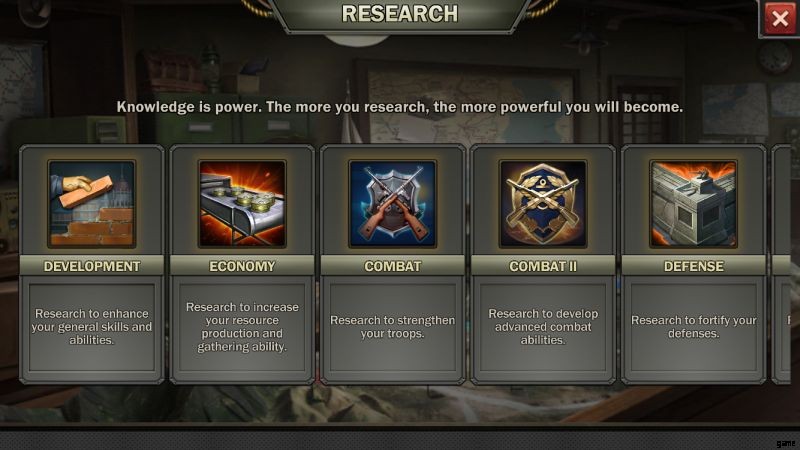 研究ラボには 6 つのカテゴリがあります。各研究は、基地をより強力にし、貴重な時間を節約できるように設計されています。開発、経済、戦闘、戦闘 II (または高度な戦闘)、防衛、スーパーソルジャーです。最初は、まだスーパーソルジャーの準備が整っていないため、後者のカテゴリについて心配する必要はありません。同じことが戦闘 II にも当てはまります。これには、研究ラボがレベル 26 である必要があるためです。開発、経済、戦闘、防御が残ります。4 つすべてが重要ですが、この特定の順序で各カテゴリに優先順位を付けます — 戦闘、防衛、経済、開発。これはセクション IV ミッションに含まれているため、最初に戦闘を行います。最後のミッションを完了するには、脅威行進速度 I の研究を開始する必要があります。敵の攻撃が発生した場合に基地の安全を優先するため、次に防御が必要です。経済は 3 番目にすべきです。これにより、基地での重要な資源の生産が改善されるからです。最後に、開発があります。これにより、最終的に軍隊の数、病院の容量など、およびその他の「一般的なスキルと能力」を増やすことができます。