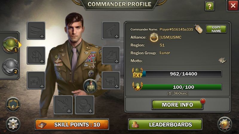 画面左上のアバターをクリックすると、司令官のプロフィールにアクセスできます。このプロフィールでは、司令官の名前を変更したり、スキル ポイントを割り当てたりできます。後者は、スキル ポイントをタップすることで実行できます。これにより、戦争、経済、バランスの 3 つの個別のカテゴリを持つスキル ツリー メニューが表示されます。これらはほとんどの場合自明ですが、スキルポイントを割り当ててツリーに従うことで、ベースにさらに多くのバフを有効にできます。たとえば、Infantry Attack I に 1 つのスキル ポイントを使用すると、「歩兵の攻撃力が増加します」が、Construction I にも同じことを行うと、建物の建設とアップグレードの速度が向上します。スレット ハンター I アンダー バランスは、脅威をハンティングする際の移動速度を向上させます。繰り返しますが、3 つのカテゴリはすべてほぼ同等 (完全に同等ではないにしても) 重要であるため、これらの戦闘でスキル ポイントを獲得した場合は、それらを使用して割り当てるようにしてください。