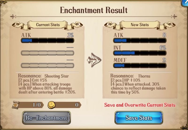 エンチャントの獲得は純粋なギャンブルに依存しているため、ボーナスの結果に満足できないことがよくあります。ウォリアークラスのヒーローが知性や回復をブーストした場合、アイテムを再エンチャントするチャンスがあり、次回はより良い結果が得られることを願っています.ただし、一度統計を再ロールすると、以前の統計に戻る機会はありません。