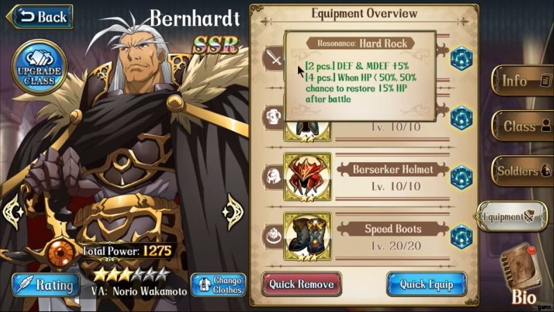 特定のアップグレードは、特定のタイプのヒーローに適用されるように明確に運命づけられているわけではなく、より多くの洞察を必要とします。ゲームで最高の戦車の例として、SSR ヒーローのベルンハルトを取り上げましょう。 HP と HP regen は戦車の親友であることを知っているので、Bernhardt の戦闘の可能性を最大限に引き出すには、Hard Rock Enchantment を彼に装備してください。これにより、戦闘後に HP が 50% に低下すると、15% 回復するチャンスが与えられます。このエンチャントが彼と非常にうまく機能する理由は、サンシェードと呼ばれる彼のパッシブスキルにより、戦闘後に追加で 30% の HP を回復できるからです。これら 2 つのアップグレードを組み合わせることで、Bernhardt に非常に高い持続可能性を提供し、他のヒーローからのサポートを必要とせずに戦闘から戦闘へと移動できるようにすることができます.