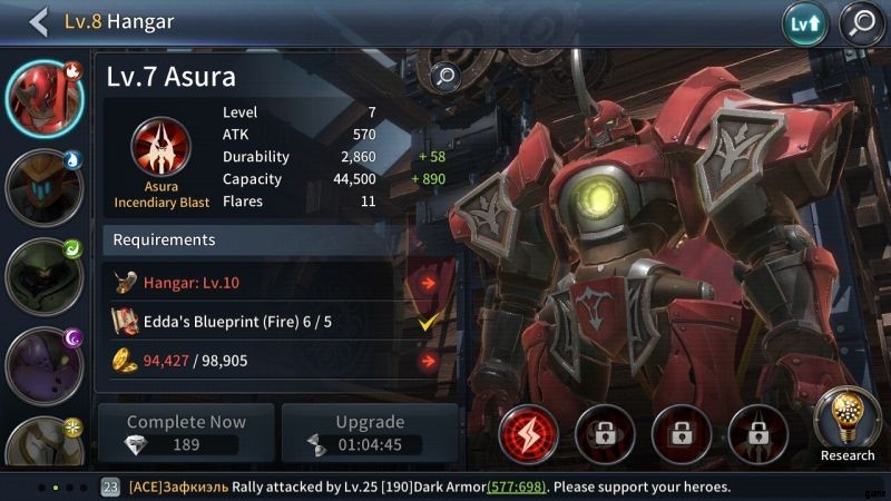 もちろん、ゲーム内の他のすべてのキャラクターと同様に、すべてのマキナをアップグレードできます。プレイヤーは、これらのヒーローをレベルアップできる格納庫にアクセスする必要があります。また、すべてのマキナには独自のスキルを装備することができ、これらの特殊な攻撃は戦場で非常に重要になる可能性があります.ただし、最も重要なことは、マキナを適切なタイミングで呼び出すことです。私たちの経験によると、マキナを召喚するのに最適なタイミングは戦闘の開始時です。たとえば、阿修羅の炎の剣はほとんどすべての敵を破壊するので、残りの敵を簡単に倒すことができます.