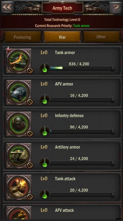 陸軍の技術は、資源の生産を向上させるプロデュース、部隊の戦闘能力を向上させる戦争、最大メンバー数、旗の数を増やすなど、陸軍自体のさまざまな側面を向上させるその他のブーストの 3 つのカテゴリに分類されます。軍隊が持つことができる時間、味方の建設を支援するときに差し引かれる時間、およびその他のブースト.