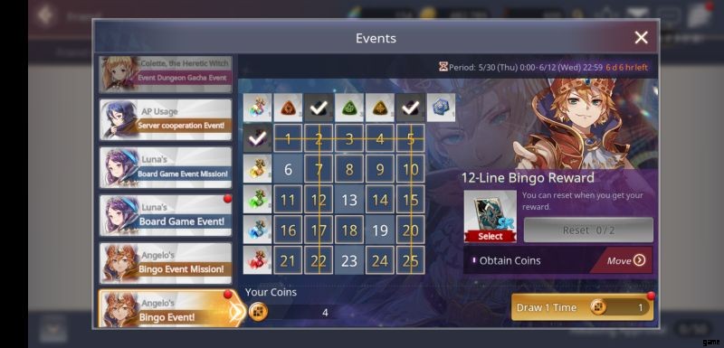 イベントに関する限り、6月12日までゲームで利用できるアンジェロのビンゴイベントには、イベントから簡単に入手できるさまざまな触媒と宝石があります.報酬は、コインでロックを解除したラインに基づいており、ゲームをプレイしながら基本的に日常的に行うことを達成することで、1 日あたり最大 6 コインを獲得できます。他のイベントと同様に、すべての報酬を獲得したら、ビンゴ テーブル全体をリセットできます。これを 2 回行うことができます。つまり、各報酬を 3 回獲得できます。