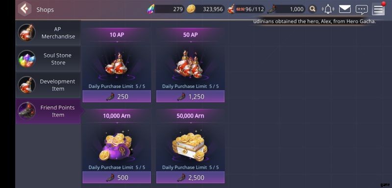 現在の特別イベントでも無料の AP は提供されないため、より多くの AP を獲得するオプションはショップになります。 APに次元ジェムを使うのはためらわれるかもしれないので、フレンドポイントを使用して、ショップから追加のAPを購入することもできます.これにより、ゲームに参加できる 30 人の友達を最大限に活用することが自然に促されるはずです。フレンドがあなたのヒーローを戦闘で使用するたびに、フレンドポイントを獲得できます。これに関連して、プロフィールの各要素を表すトップ ヒーローを必ず割り当ててください。プロフィールには、画面の左上にあるポートレートからアクセスできます。