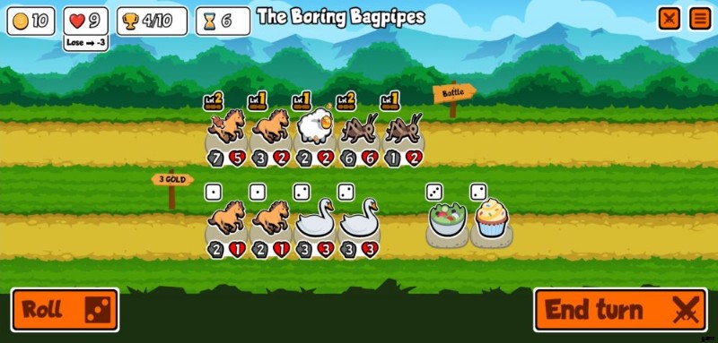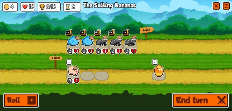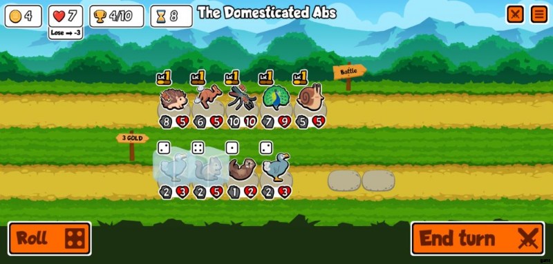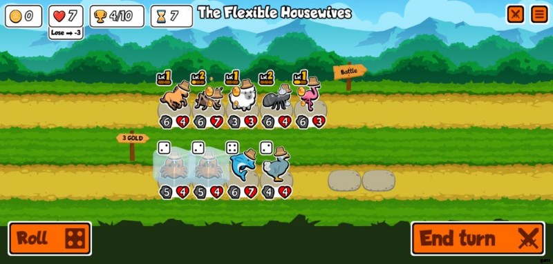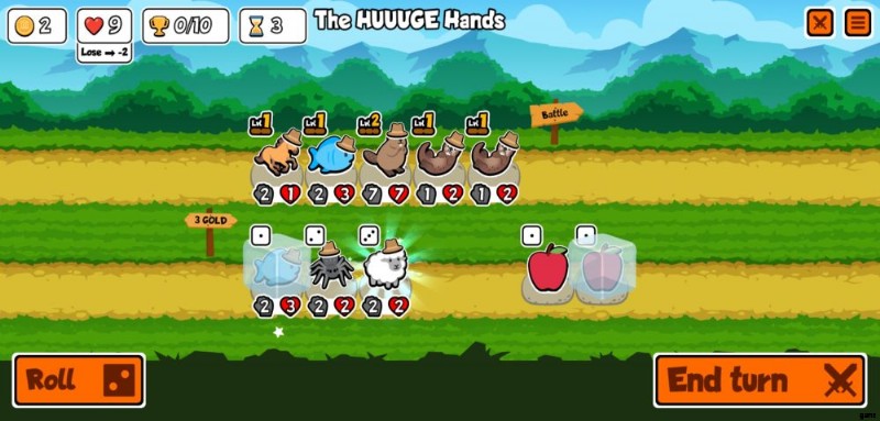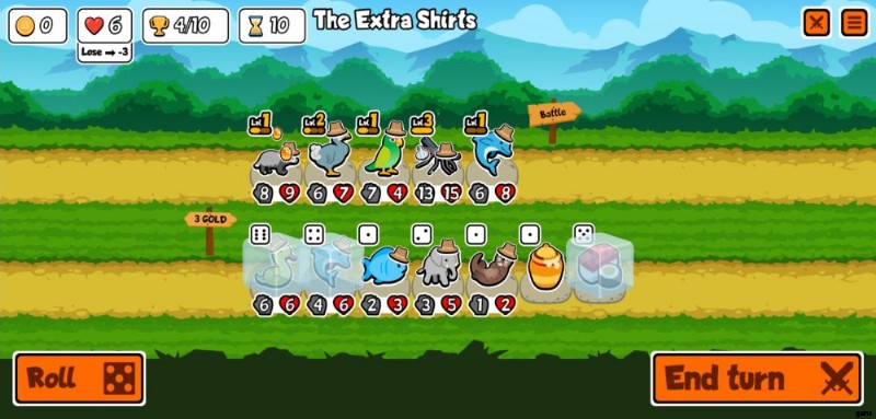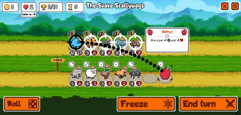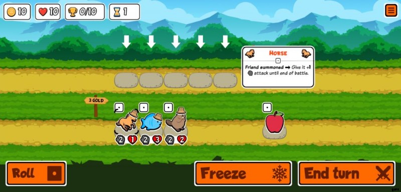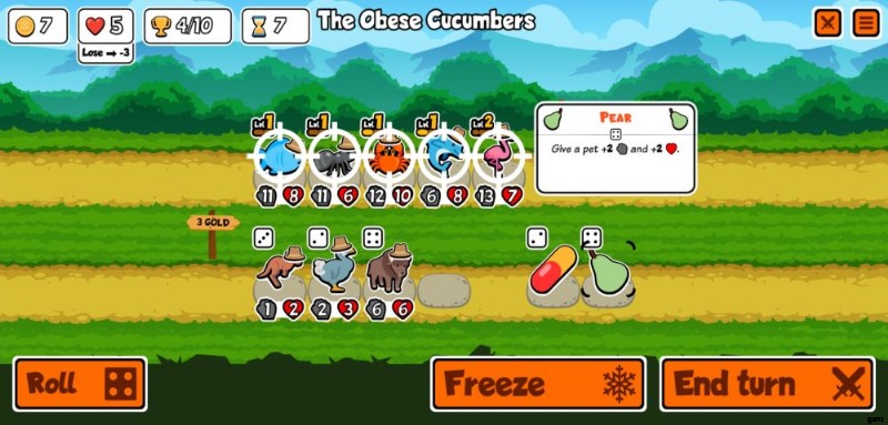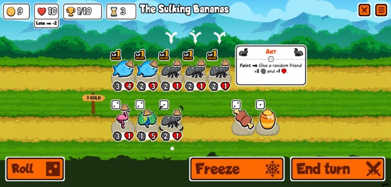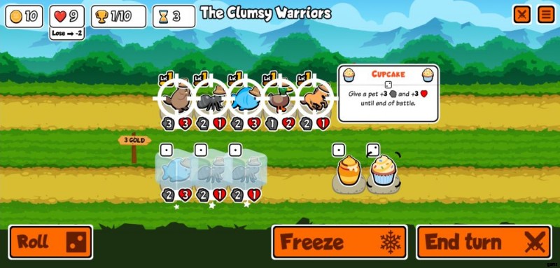 b.ペットと食品の販売 – ラインナップの下の行は、ショップが販売するものです。一方はペット、もう一方は食べ物です。これらのいずれかをタップすると、[ターン終了] ボタンの横に表示されるボタンで [凍結] を選択するか、既に凍結されている場合は [凍結解除] を選択できます。ペットと食べ物の両方を凍結するのは完全に無料です。これにより、ロール ボタンを押すか、戦闘から戻った後にペットが取り除かれるのを防ぐことができます。