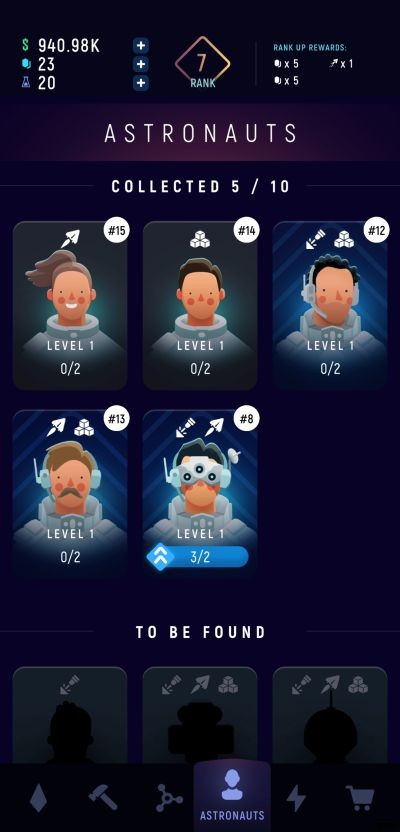 画面右下のカートアイコンからアクセスできるショップでは、レリックを使用してランダムな宇宙飛行士を募集できます。宇宙飛行士にはレアリティのグレードが異なるため、グレードによってコストが異なることが予想できます。一般的な宇宙飛行士は 5 レリックが必要です。まれな宇宙飛行士は 20 のレリックが必要です。壮大な宇宙飛行士は 50 のレリックを必要とします。伝説的なものは 100 のレリックが必要です。