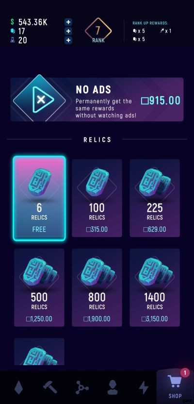 また、ショップからランダムな量の遺物を獲得することもできます。これらの景品を受け取るために実際に動画広告を再生する必要はありません。カート アイコンの上にインジケーターが表示されるたびに、それをクリックして無料のレリックを受け取ります。ショップに関連して、利用可能な宇宙飛行士を確認し、良いオファーがランダムに表示される場合があります。