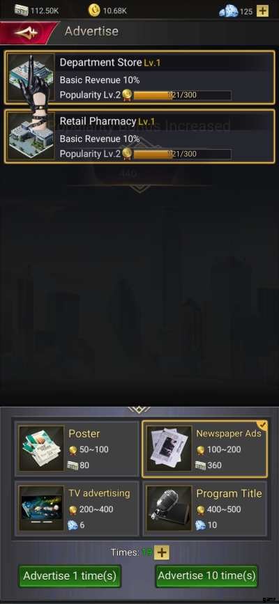 緊急事態が発生した場合、店舗に課税して即座に現金を得ることができますが、このアクションは都市に不安を引き起こします。このメソッドは、1 日 10 回しか使用できません。または、稼いだお金やダイヤモンドを使ってサービスを宣伝し、人気を高めてより早くお金を稼げるようにすることもできます。