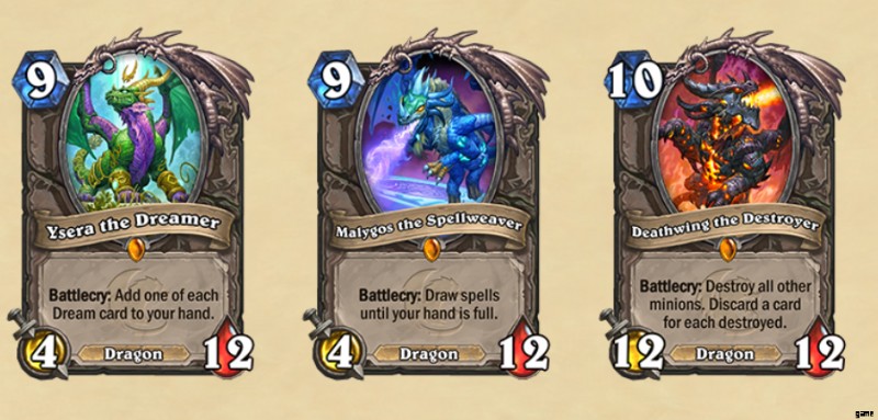クラシック セットの伝説のハースストーン ドラゴン、イセラ、マリゴス、デスウィングのトリオは、何らかの変更された能力と新しいアートワークで作り直されています。