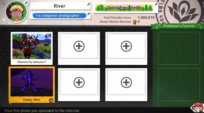 New Pokémon Snap 内のミラー教授にアクセスすると、ゲーム内のオンライン サーバーに写真をアップロードできます。これを行うには、アルバム セクションに移動し、投稿する写真をクリックして、キャプションを追加するかどうかを選択し、[アップロード] を選択します。