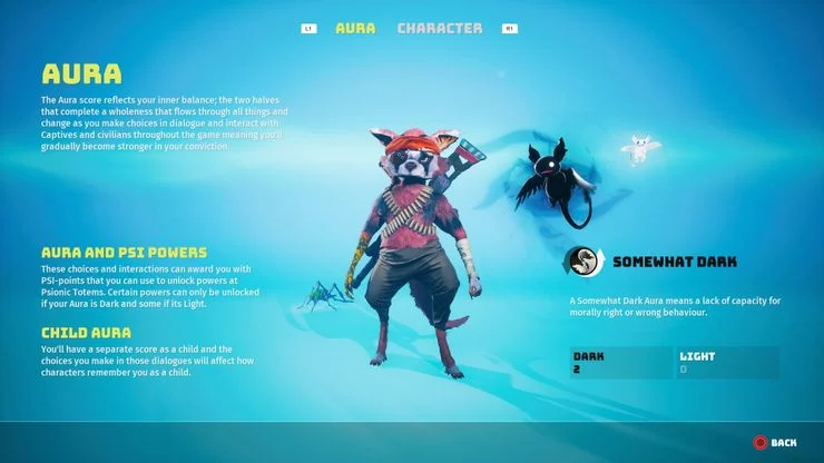 他の多くのゲームプレイ システムの中でも、Biomutant は特別なモラル システムも備えており、ダーク レッドとライト ブルーのオーラの形でプレイヤーに提示されます。
