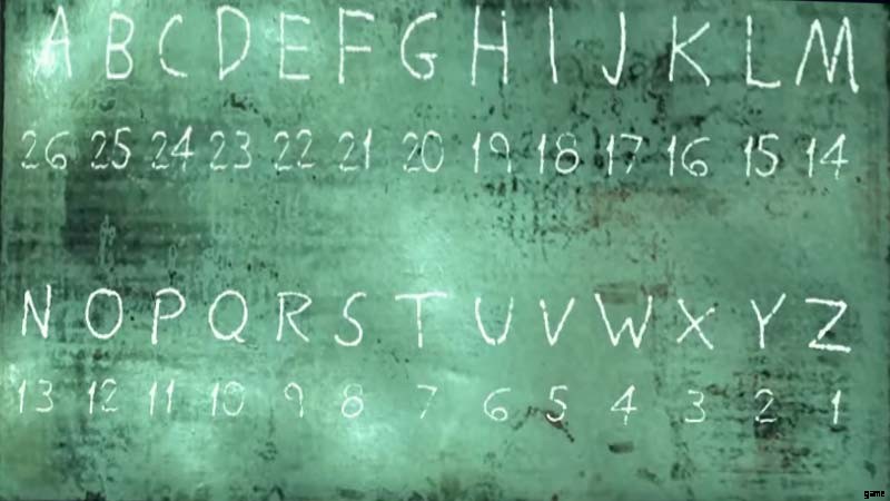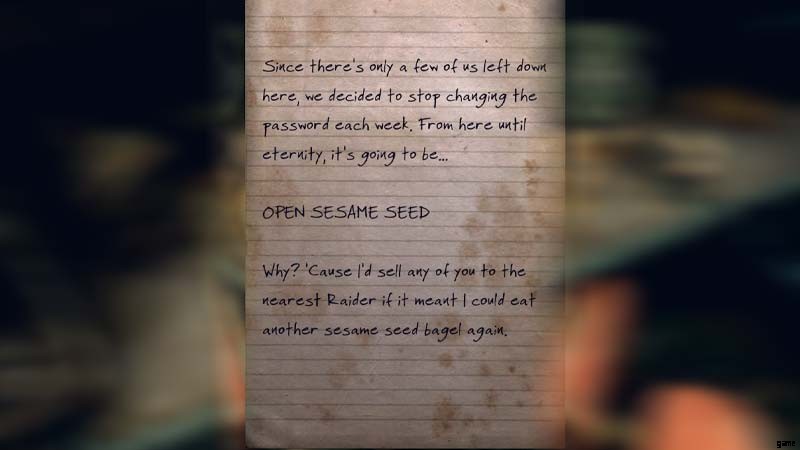「Open Sesame Seed」メッセージのメモには正確なパスワードが記載されており、2 番目のメモには、文字を数字に変換するための暗号解読システムがあることが説明されています (パネルは数字のみを受け入れるため)。3 番目のメモには、中央のターミナルのコード:8-22-8-26-14-22.