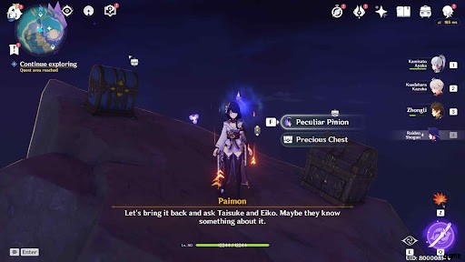 Use Electrograna and ascend the mountain to find the Peculiar Pinion feather, the cause of the anomaly on Seirai island. You will also find two chests.