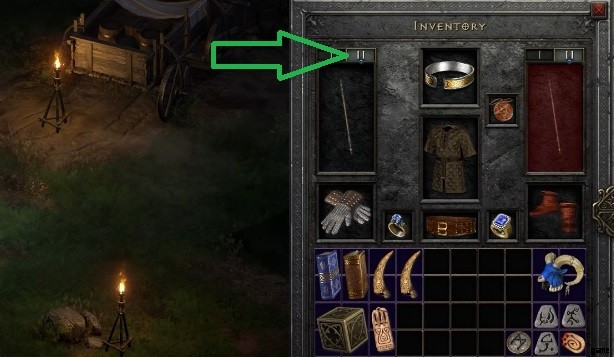 Diablo 2 Resurrected インベントリの空き容量をさらに増やすには、セカンダリ武器スロットを使用してアイテムを「保存」します。