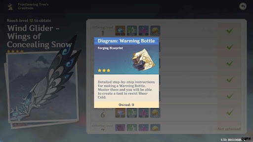 ウォーミング ボトルは原神インパクトの作成可能なガジェット アイテムで、モンドシュタットのドラゴンスパイン エリアにあるフロストベアリング ツリーで提供レベル 4 に到達した後にプレイヤーが入手できる設計図です。