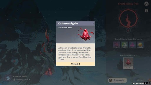 プレイヤーはクリムゾン アゲートをフロスベアリング ツリーに提供して、提供レベルを上げることができます。 1 つのオファリング レベルにはクリムゾン アゲートが 10 個必要です。プレイヤーは LVL 1 から開始します。つまり、ウォーミング ボトルの設計図を入手するには、約 30 個のクリムゾン アゲートが必要です。