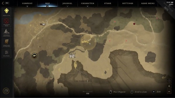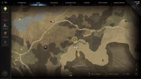 この地域の左上に向かって北に進むと、ノースフォークにあるレタムズ ピック鉱山があります。二つの十字路の間は、道路を挟んだ右側に建物が見えるエリアです。この建物のポーチには、略奪用の別の食料箱が簡単に見つかります。