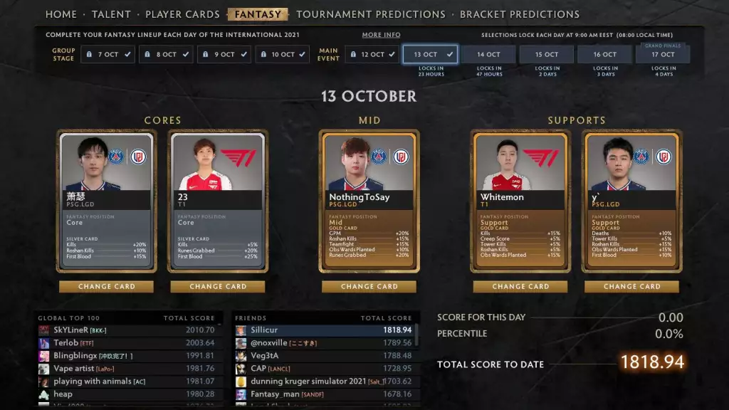グループ ステージとメイン イベントの 1 日目のファンタジー予測の後、1818.9 ポイントを獲得し、Dota 2 ファンタジー予測の上位 1% にランクされました。