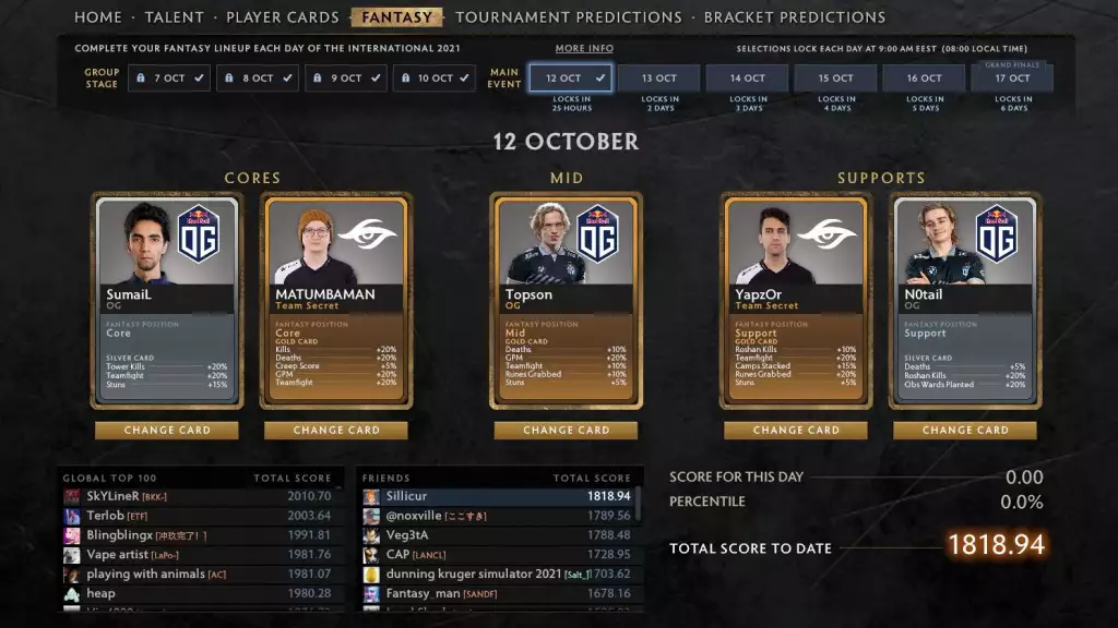 グループ ステージの 1 日目、2 日目、3 日目、4 日目のファンタジー予測の後、1818.9 ポイントを蓄積し、Dota 2 ファンタジー予測の上位 1% にランクされました。